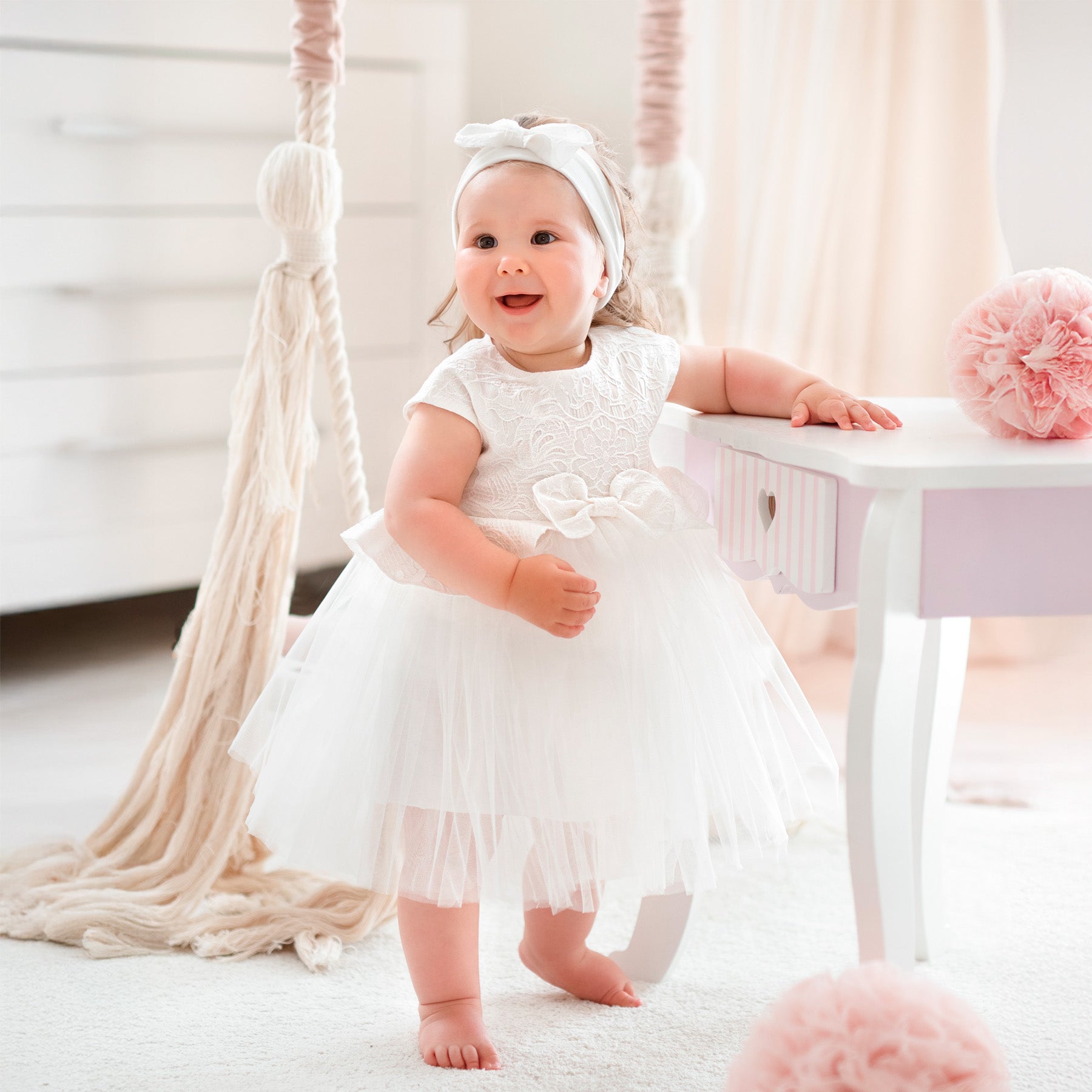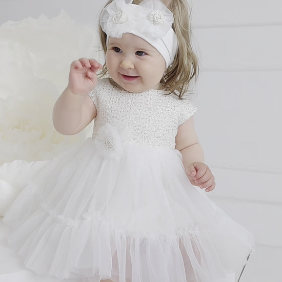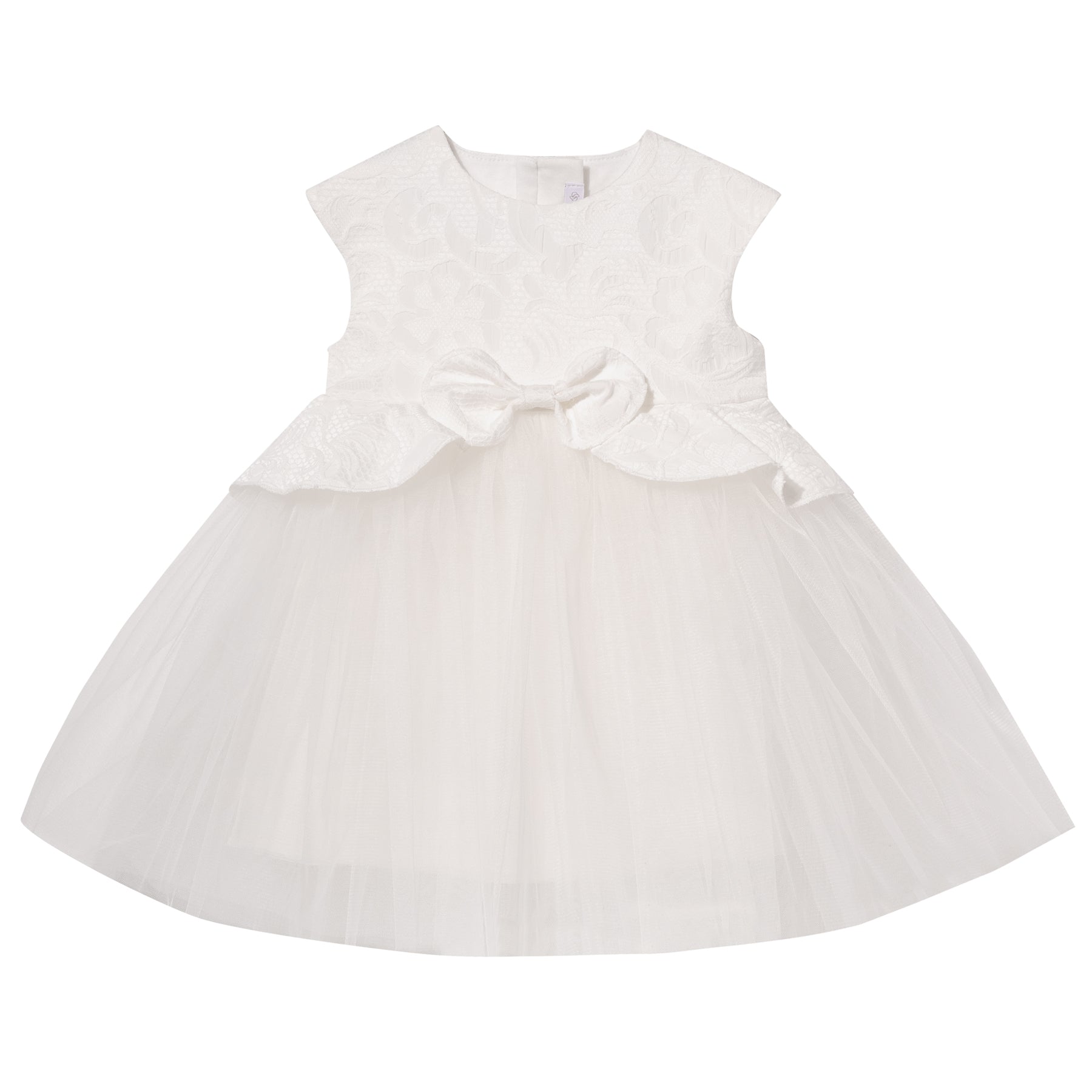 This graceful dress combines a richly textured jacquard bodice with a flowing tulle skirt. A structured bow at the waist adds a classic touch, making it perfect for elegant occasions.
