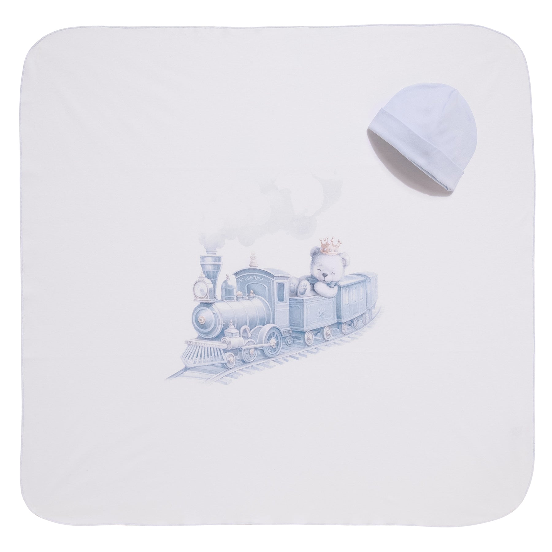 A charming newborn set that includes a babygrow, soft hat, and matching blanket – all featuring the collection’s signature crowned bear on a vintage train.