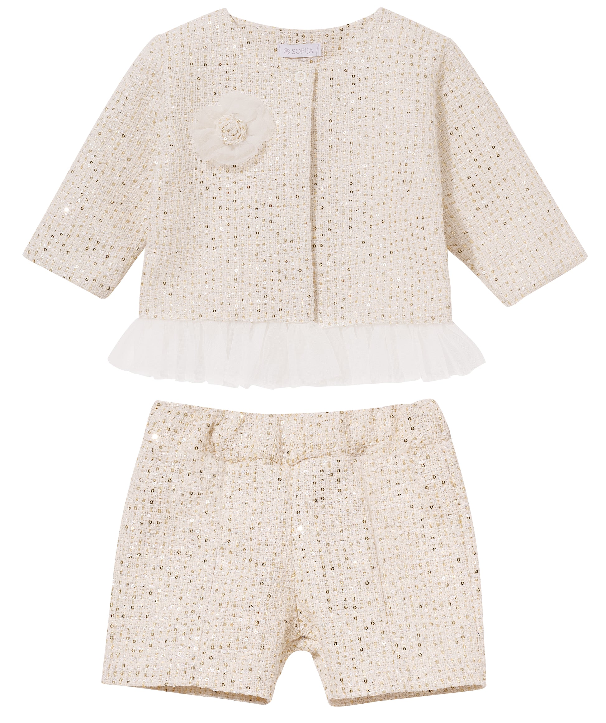 It includes a short, collarless jacket with golden thread accents and matching shorty with soft tulle trim, creating a chic and playful silhouette.jacket-100% polyester, linen: 100% cotton, shorts 100% polyester.