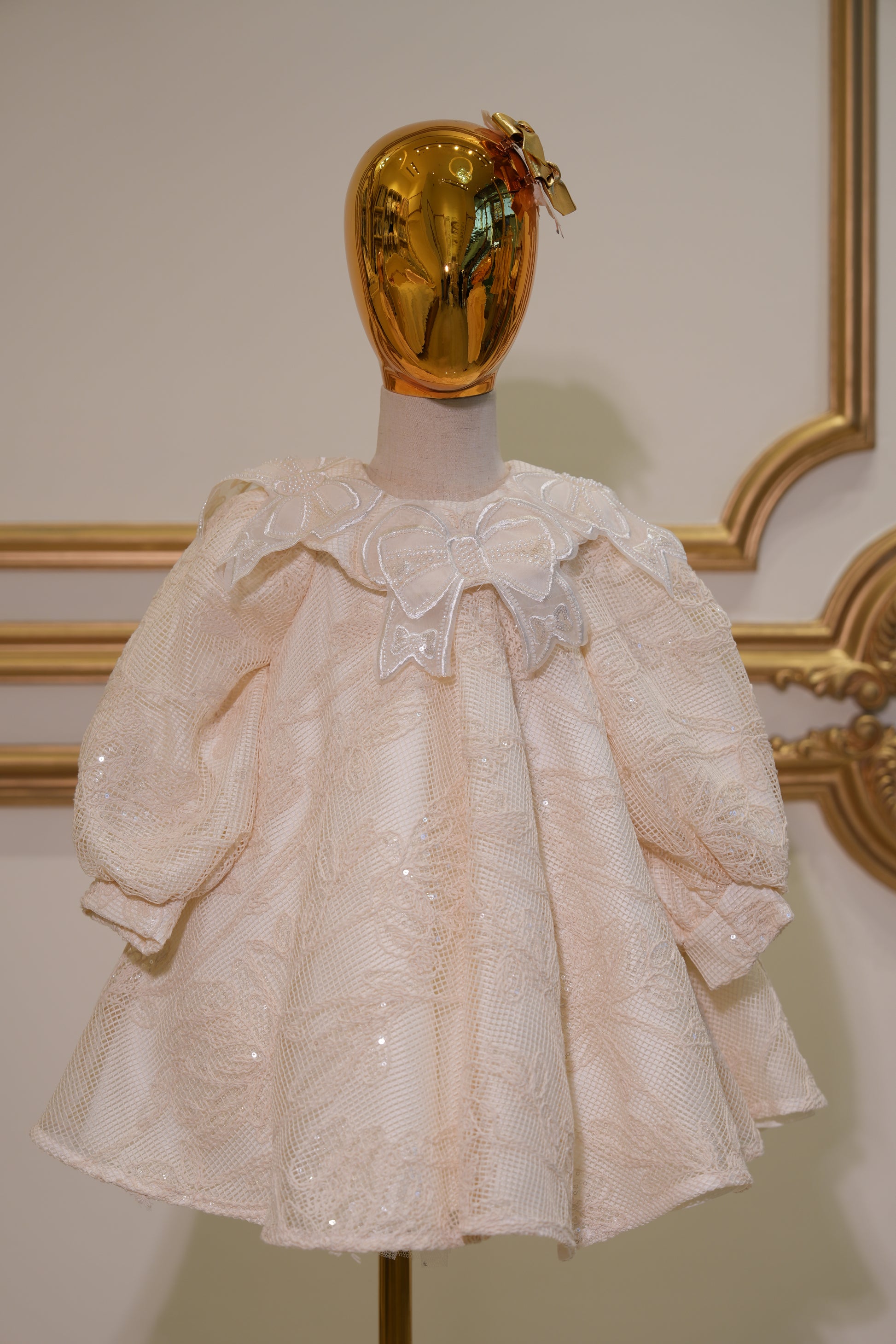 The dress is characterized by its intricate grid-patterned lace, dramatic puff sleeves, and a prominent bow embellished with faux pearls and sequins.