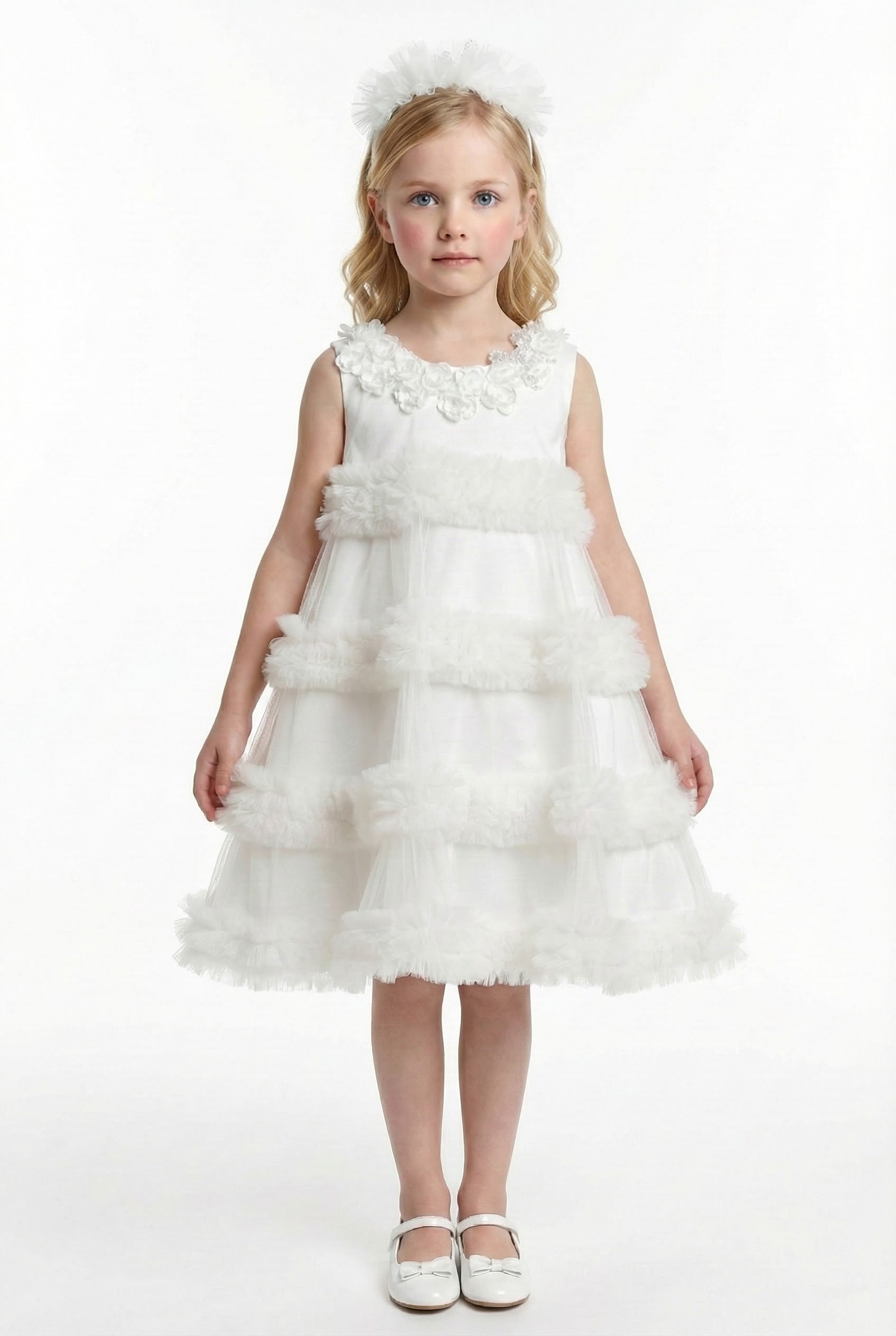 The Dress: A White occasion dress featuring a voluminous, tiered silhouette. It is defined by its dramatic ruffled Pierrot collar embellished with a string of delicate faux pearls along the neckline. The design includes long, airy sleeves with elasticated ruffled cuffs and a multi-layered, tiered skirt that provides significant movement and bounce.
